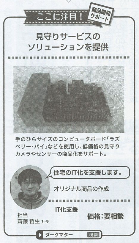 弊社では、超小型コンピュータボード「ラズベリー・パイ」などを使用した見守りサービスのソリューションを提供しています。お客様のご要望に合わせて、商品を製作しますので、「こんなことできないかな」と思うことがありましたら、お問い合わせください。