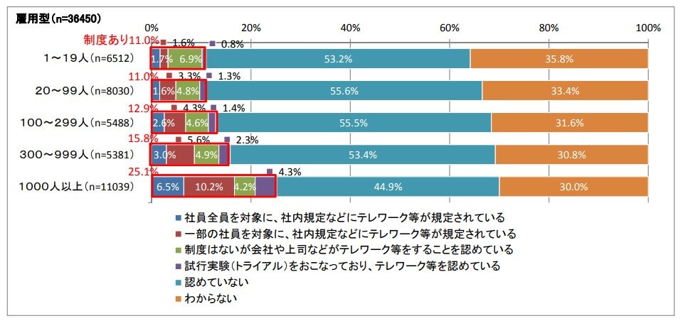 小規模企業者(1~19人)の場合、緑色で示す「制度はないが会社や上司などがテレワーク等をすることを認めている」という回答が、他の規模の企業に比べて最も高く6.9%。また制度の有無が「わからない」と回答した割合も最も高い35.8%でした。
