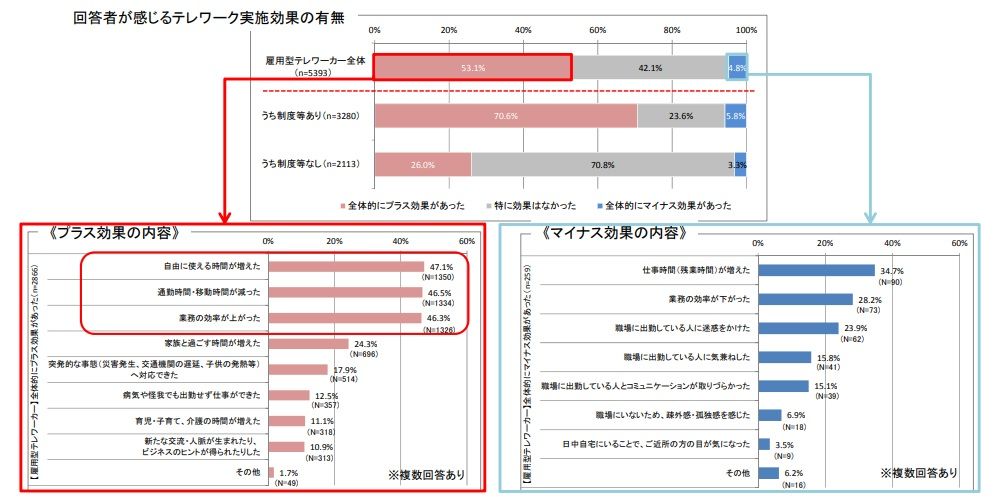 ○テレワークの実施効果について、雇用型で「全体的にプラス効果があった」と回答している割合は、「制度等あり」 での約7割に対し、 「制度等なし」では3割未満。勤務先に制度等があることが、テレワーク実施のプラス効果を高 めている。