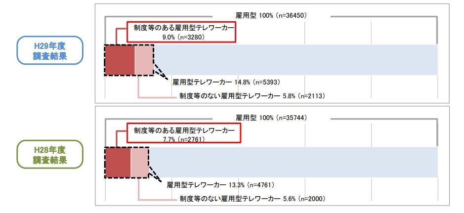 民間会社や官公庁などで働く雇用型の働き方を100%とした場合、テレワーク制度等に基づく雇用型テレワーカーの割合は、9.0%、制度等のない雇用型テレワーカーは5.8%(P.10)。平成28年度の調査結果と比較すると、「制度等のある雇用型テレワーカー」が+1.3%、「制度等のない雇用型テレワーカー」が+0.2%増加しています。