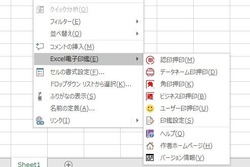 3.電子印鑑を押したい場所にカーソルを持って行き、右クリックし「Excel電子印鑑」を選択。「認印押印」「角印押印」など捺印したい種類の印鑑を選ぶと、押すことができる