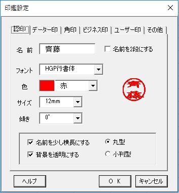 2.上部に印鑑の種類がタブになっているので、設定したいタブを選択。名前を入力し、フォント、色、サイズ、傾きを設定し、「OK」をクリック