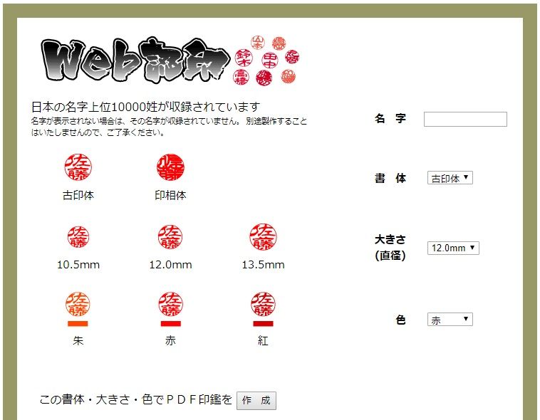 まずお試しということであれば、「Web認印」というサービスは手軽。名字、書体、大きさ、色を選ぶだけで電子印鑑(PDF)が作成できます。日本の名字上位10000姓を収録。ただし登録されている名字でしか作成できません。また個人使用・企業内での使用はOKですが、商業使用(実際の印章の版下にして使用するような行為)は禁止です。