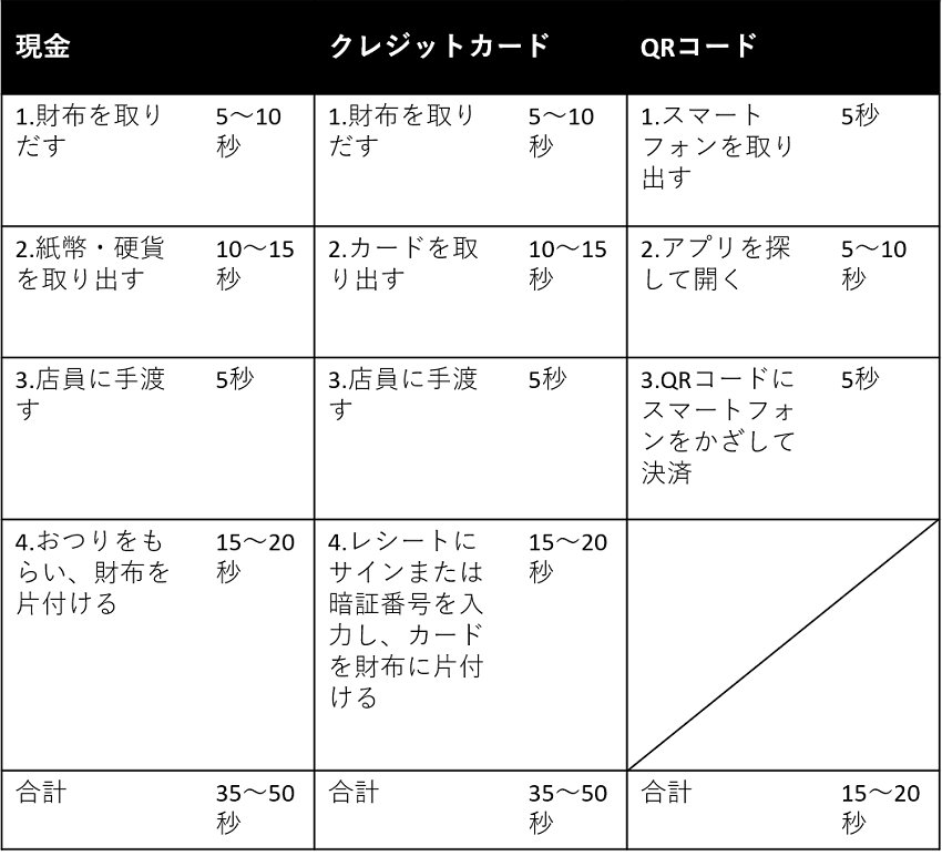 現金決済、クレジットカード決済、RQコード決済、それぞれについて、決済にかかる時間を表にまとめました(筆者の主観です)。