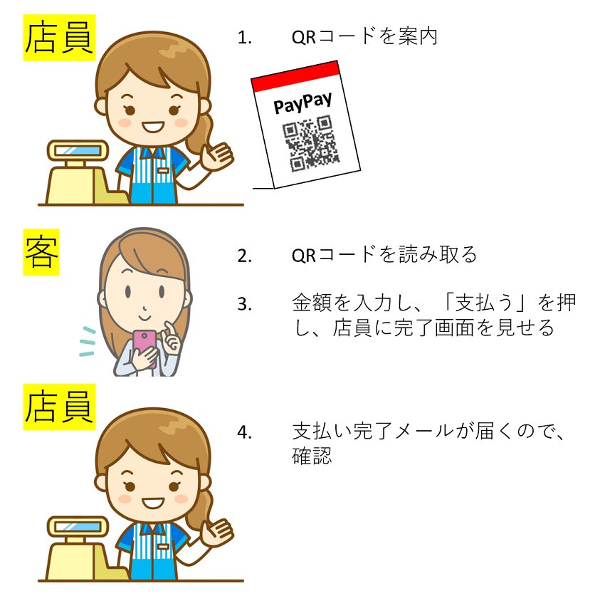 (1) 店は、店に割り振られている固有のQRコードを顧客に案内します。レジ横にPayPay用のQRコードを置いているケースが多いです。
