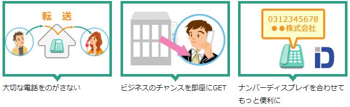 会社の電話番号を他の番号に転送(ボイスワープ )することで、外出や出張、在宅でも会社宛ての電話を受ける事ができます。