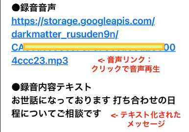 留守電くんの大きな特徴としてメール本文中に音声の再生リンクがあるため、電話のメッセージ内容を「音声」と「文字起こしされたテキストメッセージ」の両方で内容を確認できます。