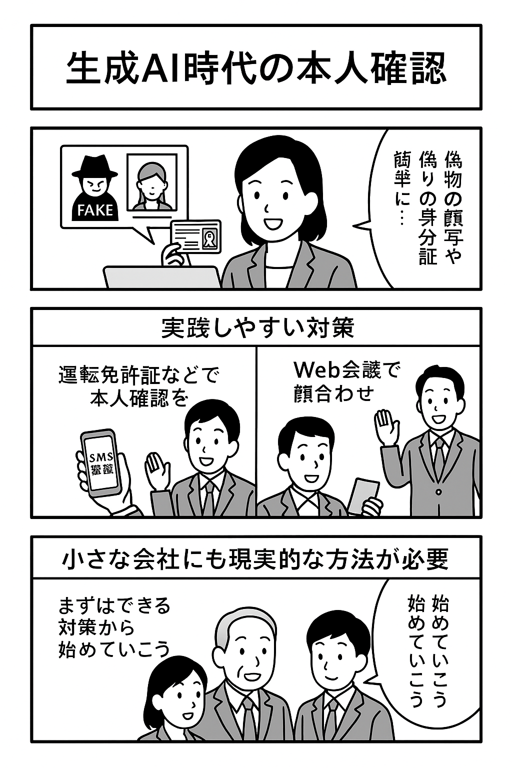 生成AIの進化により、偽の顔写真や音声、さらには身分証までが簡単に作られる時代となりました。このような状況では、詐欺やなりすまし被害を防ぐために「本人確認」の重要性がますます高まっています。 しかし、高度な認証システムを導入するのは、大企業でなければ現実的ではありません。では、中小企業や個人事業主はどう対策すればよいのでしょうか?本記事では、中小企業でも実行可能な実用的な本人確認手段について解説します。