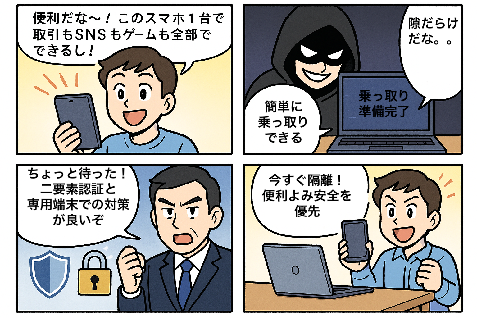 証券会社が求める二要素認証(2FA)に使用するスマートフォンも、取引専用のものを準備。 SNSやショッピングなど他の用途には使わず、攻撃対象になるリスクを最小限に。